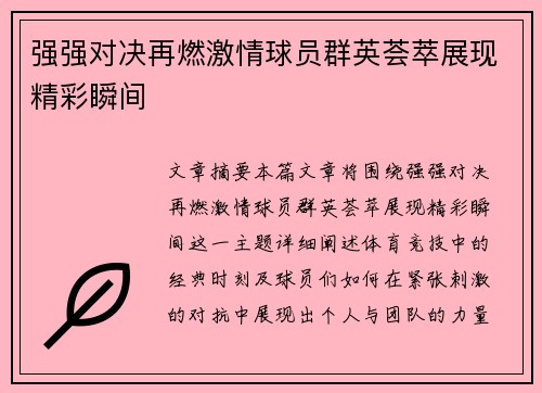 文章摘要:本篇文章将围绕“强强对决再燃激情,球员群英荟萃展现精彩瞬间”这一主题,详细阐述体育竞技中的经典时刻及球员们如何在紧张刺激的对抗中展现出个人与团队的力量。文章将从四个方面展开分析:一是强强对决...